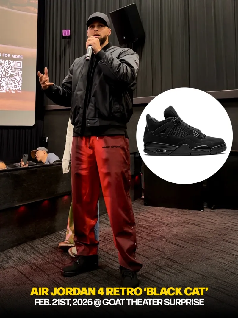 2月21日电影《GOAT》首映礼现场,上脚Air Jordan 4 Retro“黑猫”。