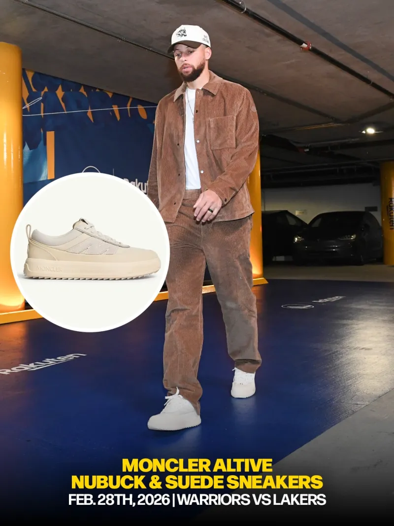 2月28日勇士主场对阵湖人的比赛期间,上脚Moncler Altive牛巴革&麂皮厚底休闲运动鞋。